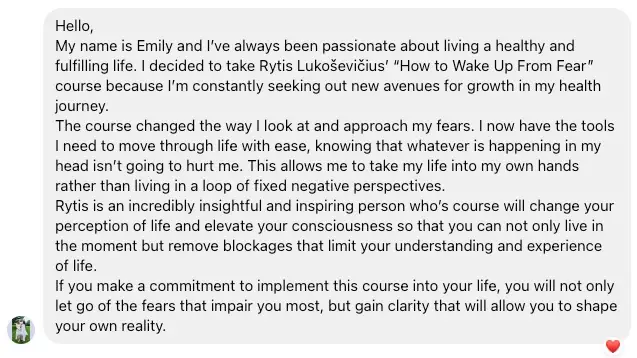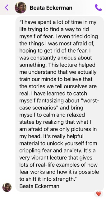 I won’t promise a miracle in just one lecture, but I’ll show you the path. You’ll be able to understand your fears, rise above them and then gain the skills to consistently work on your own.